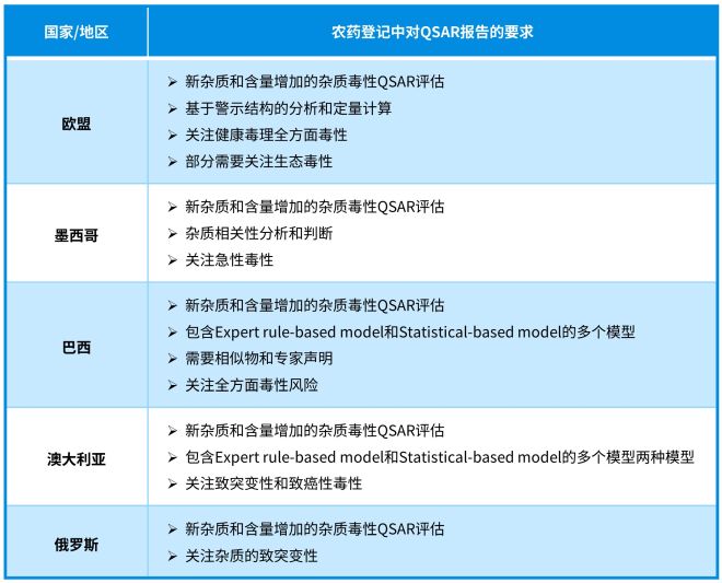 农药原药在生产过程中会出现杂质,若根据杂质的含量和类型等无法判定是否为毒理学相关杂质时,需要进行毒理学资料和环境毒理资料的认定。杂质往往都是新物质,毒理相关数据较少,无法确定毒性风险。另外,这些杂质还往往含量较低且不易于获取,从而难以开展测试。在农药杂质的毒理认定中,欧盟、墨西哥、巴西等很多国家和地区都建议采用QSAR预测的方式获取数据进行杂质毒性评估。